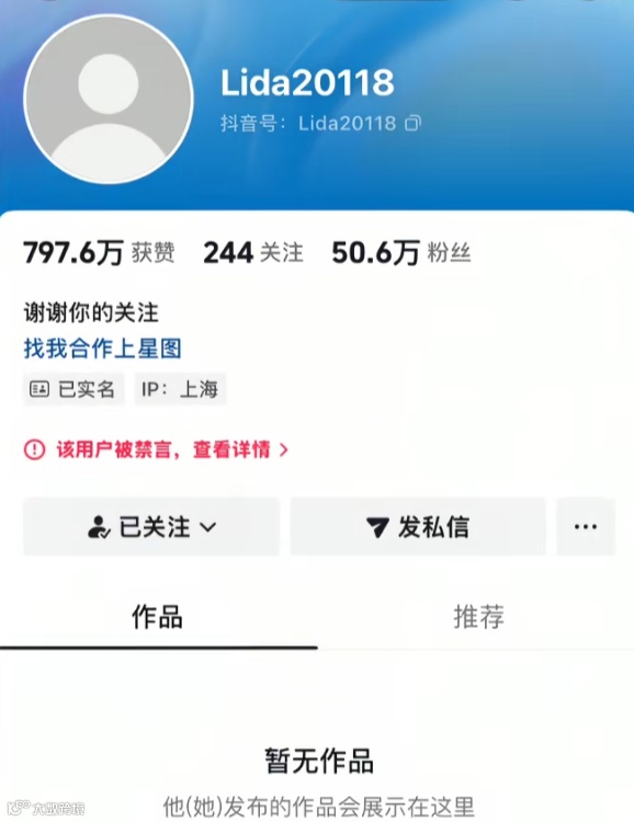 9月26日,在短视频平台拥有约50万粉丝的博主“Lida不是力气大”的账号被无限期封禁,1200多个作品被清空。