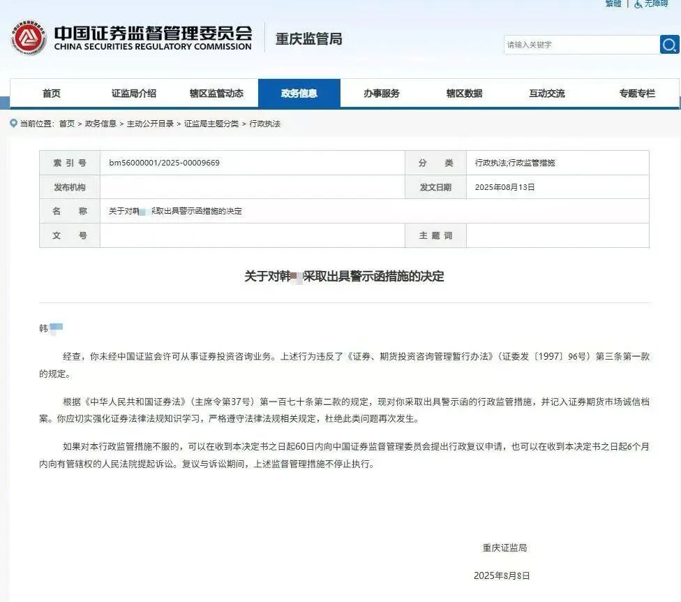 目前,该工作室已被重庆市场监督管理局列入“经营异常名录”。重庆证监局也认定韩某确实存在非法推荐股票的行为,并且对她出具了警示函。