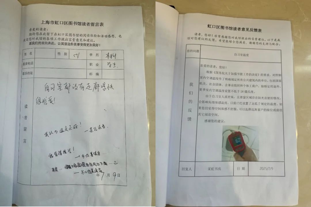 Another note pointed out that the self-study room felt hotter than the hallway. The library explained the balance between government temperature regulations and user comfort, and advised readers to choose spots away from sunlit windows if they feel too warm.