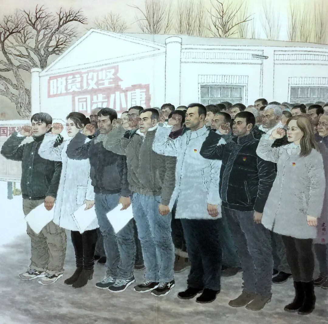 在第三幅画作《誓言》中,画家李建国描绘了一个农村村庄的干部为脱贫攻坚事业宣誓的场景,却被曲解为“强迫”维吾尔族人民在清真寺外宣誓忠诚。