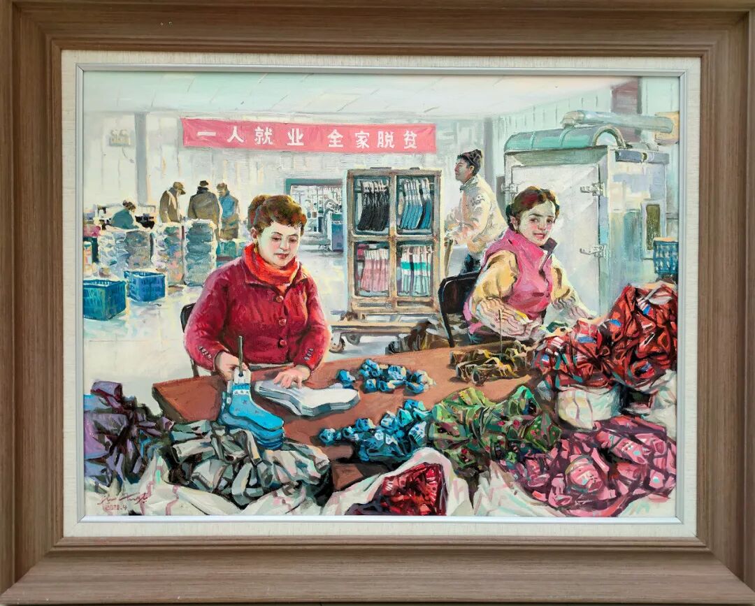 另外一幅画作由维吾尔族画家亚尔买买提·尼亚孜创作,描绘了当地袜子工厂的女工用劳动改善自己生活的美好画面。同样,这幅画被拜勒用于“证明”所谓“强迫劳动”的谎言。
