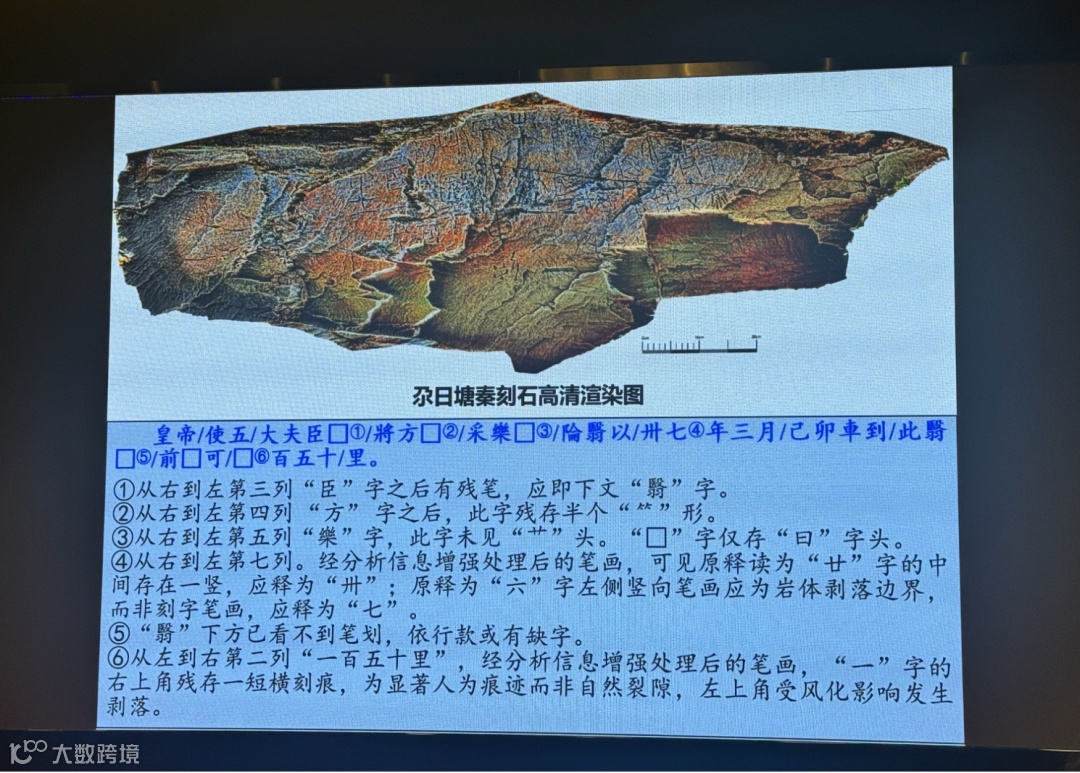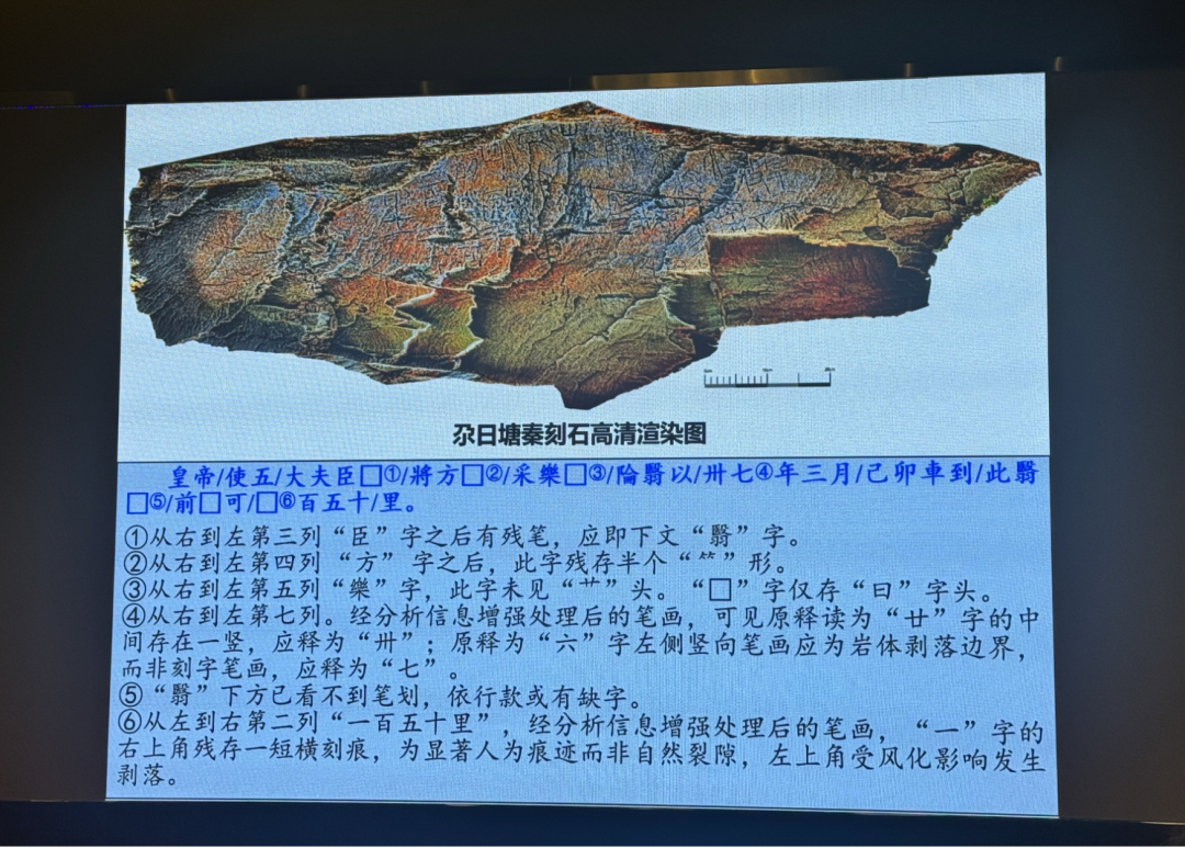 据介绍,刻石全文共12行36字,外加合文1字,共37字,保存较完整的文字信息为“皇帝/使五/大夫臣□/將方□/采樂□/陯翳以/卅七年三月/己卯車到/此翳□/前□可/□百五十/里”。