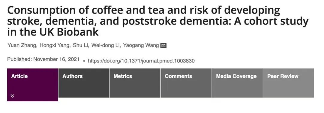 2021年,天津医科大学研究团队发表在《公共科学图书馆-医学》上的一项研究发现:不论是喝咖啡还是喝茶,都可以降低患痴呆症和中风的风险,既喝茶又喝咖啡效果更好。