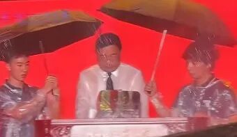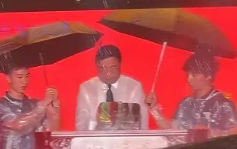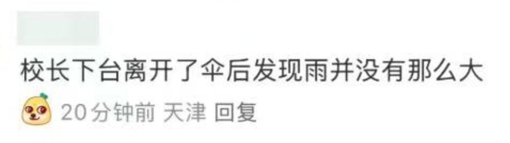 有网友发布视频称,当晚突降大雨,两名学生上台给正在演讲的校长撑伞,却正好把两把雨伞之间的空隙留给了校长,雨水顺着伞的边缘流到了校长身上,校长成功从被雨水“滴灌”到被“浇灌”,到最后衬衫都湿透了。