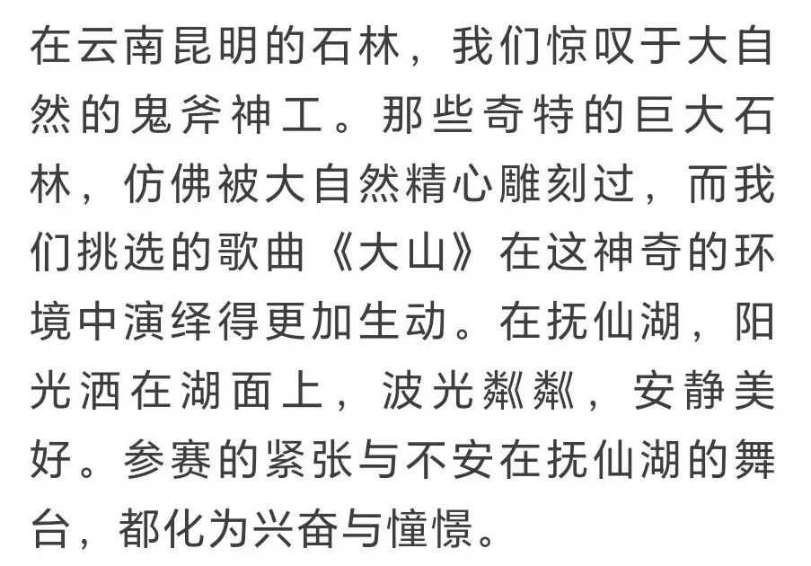 In Yunnan's Stone Forest, the cast marveled at nature's sculpted rock formations while performing the song Great Mountains amidst the landscape. At Fuxian Lake, shimmering waters transformed their anxiety into excitement.