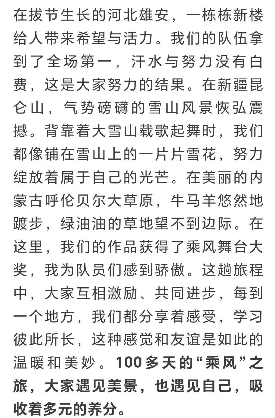 Yip highlighted Xiong'an's rising towers in Hebei as symbols of hope – where her team claimed first place through collective effort. Dancing before the Kunlun Mountains' snow-capped peaks in Xinjiang, she felt "like a snowflake glowing on the majestic range." Their final performance on Hulunbuir's boundless grasslands earned her team the show's top award.