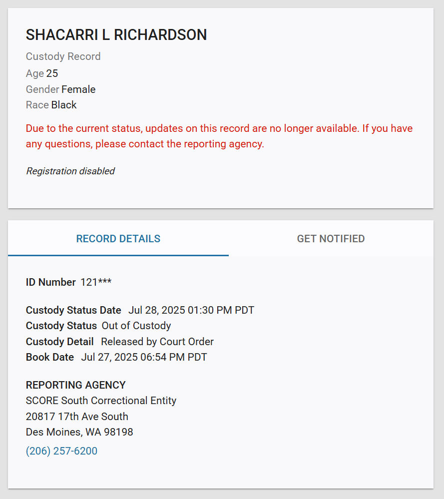 The 25-year-old Richardson was booked into the South Correctional Entity (SCORE) in Des Moines, Washington, at 6:54 pm. The incident landed Richardson in custody for just shy of 19 hours at the SCORE.