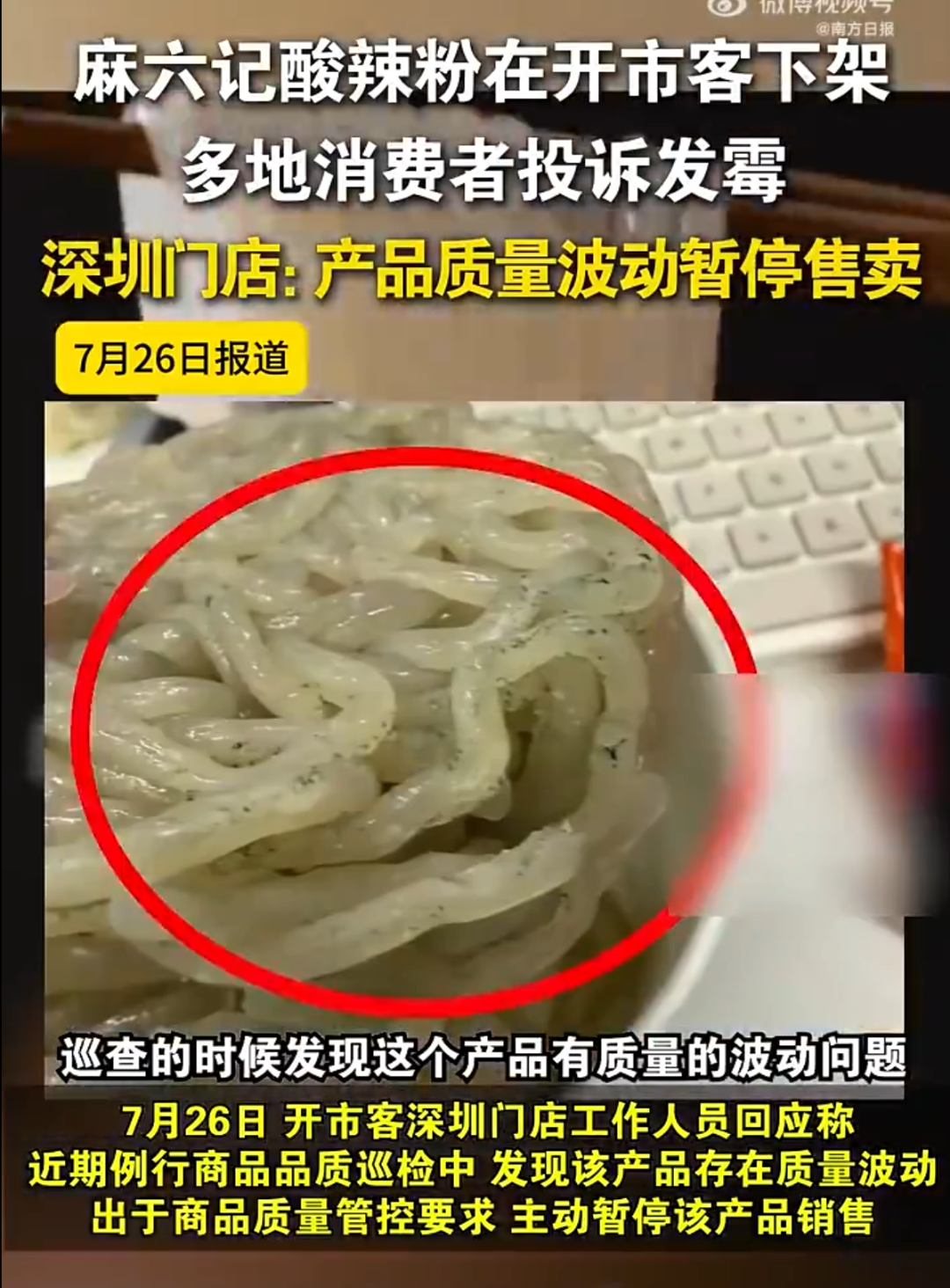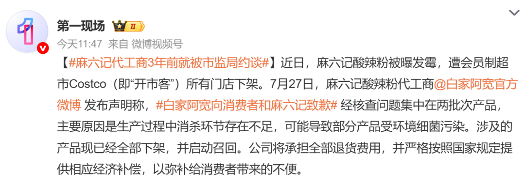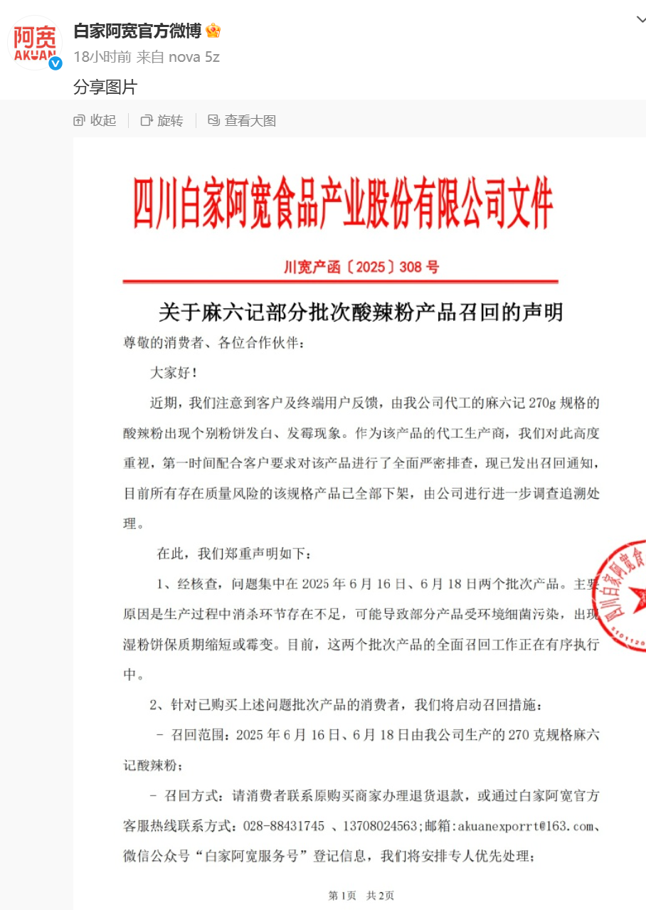 据最新消息,7月27日,四川白家阿宽食品产业股份有限公司发布声明,称其代工的麻六记270g规格酸辣粉部分批次出现质量问题,涉及2025年6月16日、6月18日两个批次,因生产过程消杀环节不足,导致产品可能受细菌污染,出现粉饼发白、发霉现象。