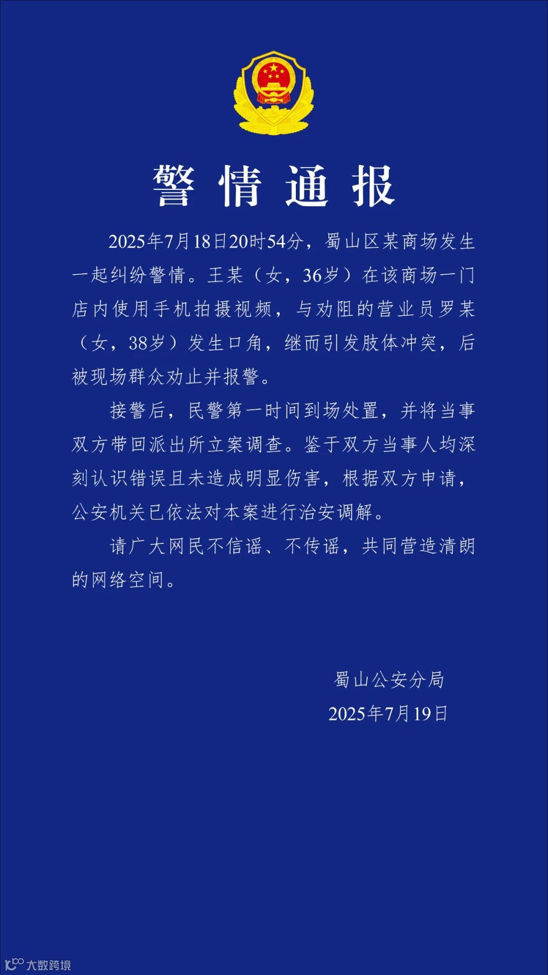 2025年7月18日20时54分,蜀山区某商场发生一起纠纷警情。王某(女,36岁)在该商场一门店内使用手机拍摄视频,与劝阻的营业员罗某(女,38岁)发生口角,继而引发肢体冲突,后被现场群众劝止并报警。