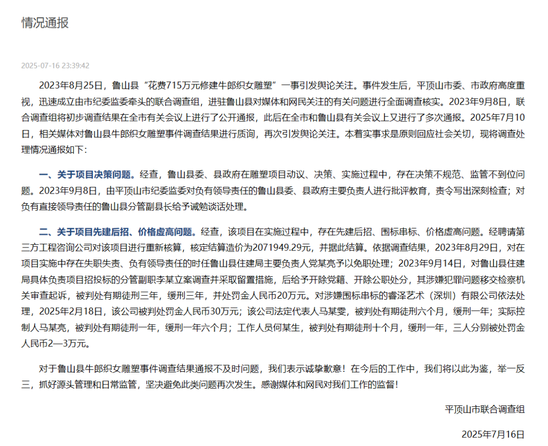 2023年8月25日,鲁山县“花费715万元修建牛郎织女雕塑”一事引发舆论关注。事件发生后,平顶山市委、市政府高度重视,迅速成立由市纪委监委牵头的联合调查组,进驻鲁山县对媒体和网民关注的有关问题进行全面调查核实。2023年9月8日,联合调查组将初步调查结果在全市有关会议上进行了公开通报,此后在全市和鲁山县有关会议上又进行了多次通报。2025年7月10日,相关媒体对鲁山县牛郎织女雕塑事件调查结果进行质询,再次引发舆论关注。本着实事求是原则回应社会关切,现将调查处理情况通报如下: