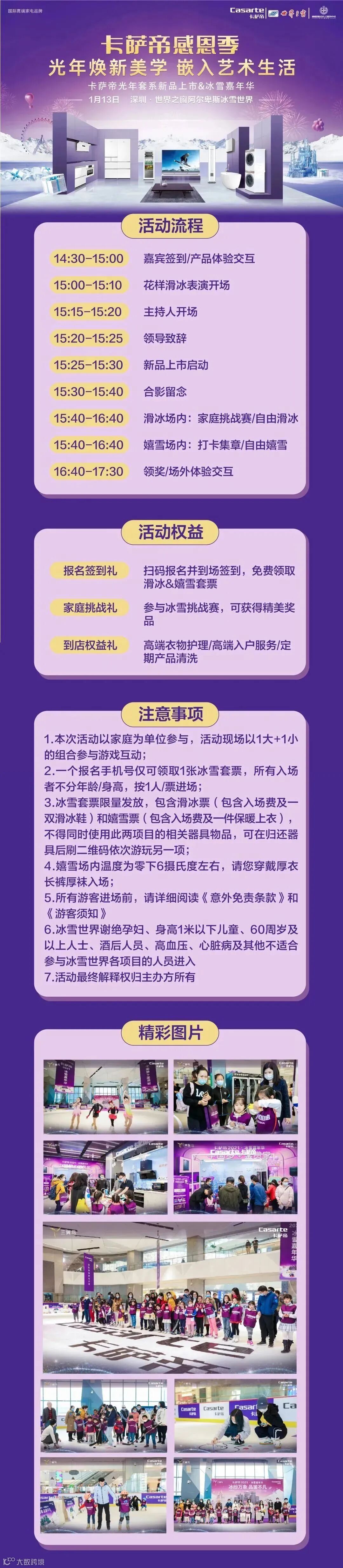 1、所有入场者不分年龄、身高,按1人/票(不可换人、一次有效) ,本次活动仅提供冰雪套票(1月13日周五14:30-17:30)