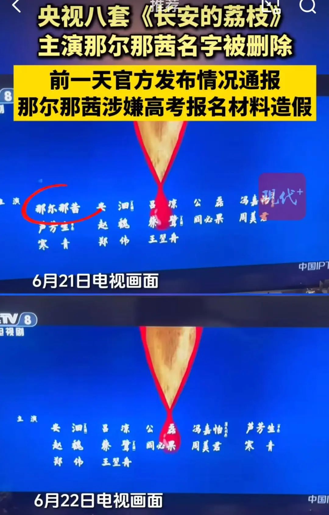 6月22日晚,央视八套播出的《长安的荔枝》演员表里,删除了那尔那茜的名字。