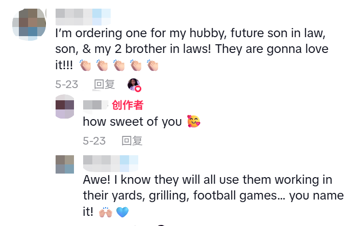 我要给我的老公、准女婿、儿子和两个姐夫各买一个,他们一定会喜欢的!在院子里干活、烧烤、看橄榄球比赛时都用得上。