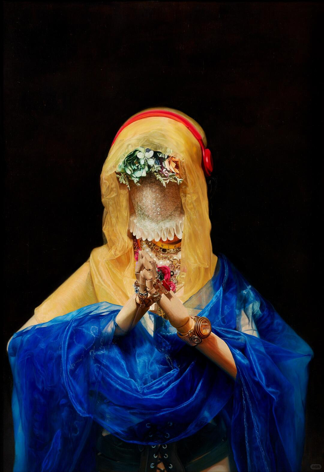 这幅作品,首先闯入观众眼帘的是红黄蓝三原色,构成一位在祈祷的女性形象,头上戴着耳机、黄色纱巾和“模特”身上盖着的蓝色纱巾,“模特”的脸则由大家网购时经常见到的气泡膜所覆盖,看不到容貌。