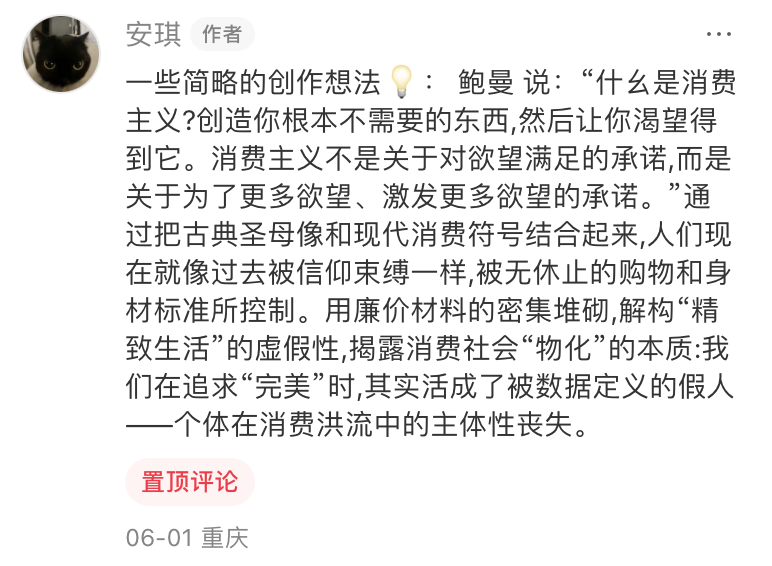 有网友在国外社交媒体上分享并介绍了这一作品,“画作将古典圣母意象与现代消费符号巧妙拼贴:气泡膜‘包裹’面庞,珠宝堆叠如山,木质双手合十祈祷。廉价材料营造出‘精致’的幻象,最终刺破消费主义的泡沫。今天,我们被购物冲动和身材焦虑所困,就如同人类曾一度受制于宗教教条。画作传达的深层信息引人深思,唤起共鸣与同理。”