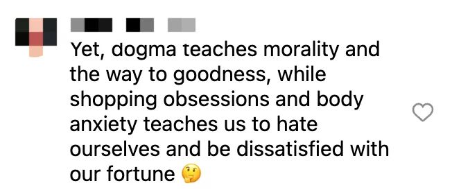 “教条教导我们道德和行善之道,而购物狂热和对身体的焦虑却让我们自我厌恶,对生活感到不满足。”