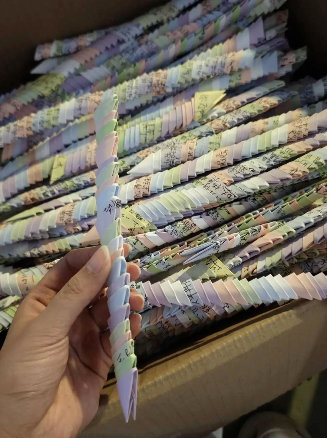 仔细看每一部分都由无数个微型的三角插拼接而成。“大概花了30多万张便利贴,我发动了亲朋好友大概20多个人,先后折了两个多月才完成。”简珊珊说,作品的构思其实很简单,就是想表达祝愿、祝福。“所以,我也让亲友们在某些便利贴上写上了自己想说的祝福话。”