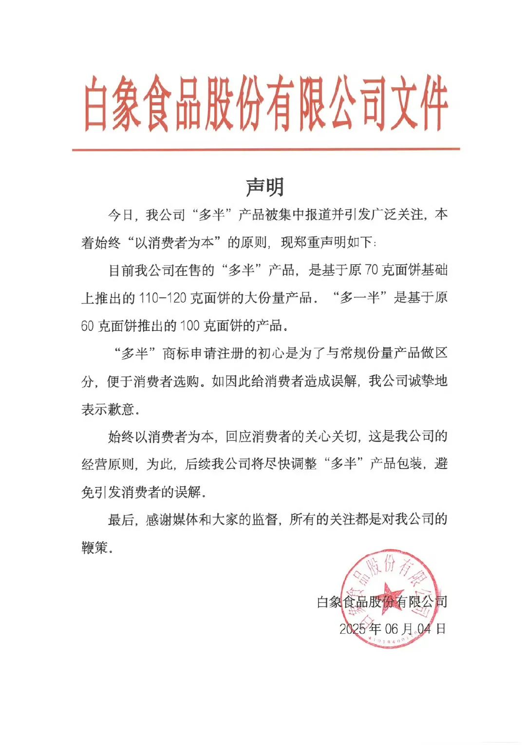 白象解释称,“多半”商标申请注册的初心是为了与常规份量产品做区分,便于消费者选购。如因此给消费者造成误解,我公司诚挚地表示歉意。后续公司将尽快调整“多半”产品包装,避免引发消费者的误解。