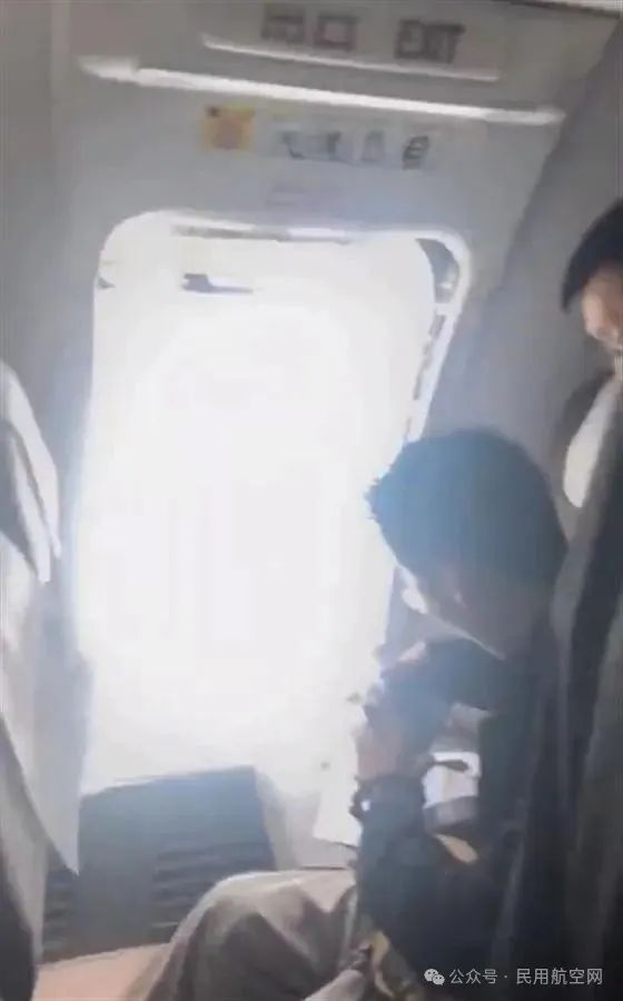 视频显示,飞机机翼附近的应急舱门已被打开,有乘客情绪明显惊讶。
