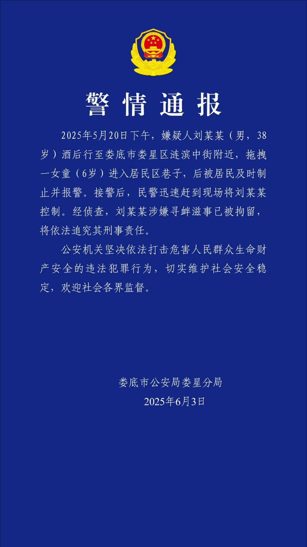 The bulletin detailed that on the afternoon of May 20, Liu, a 38-year-old man, dragged the child near Lianbin Middle Street in Louxing district, Loudi city. Residents promptly intervened to stop him and reported the incident. Police officers swiftly arrived at the scene and brought Liu under control.