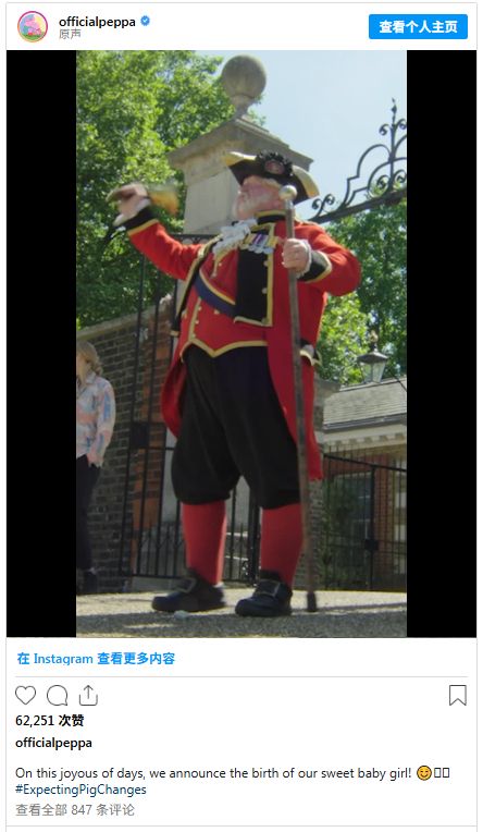 据英国电视节目《早安英国》报道,《小猪佩奇》中的猪妈妈在伦敦圣玛丽医院林都翼产房生下三胎,是个女儿,取名伊薇(Evie Pig),该节目还公布了一家五口合照。