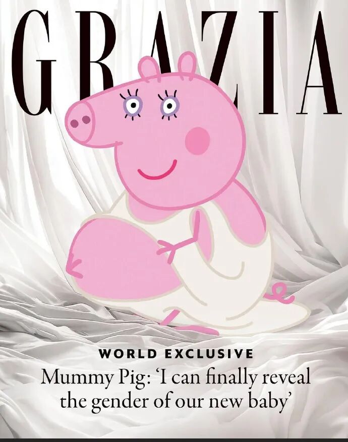 4月,猪妈妈还以孕照登上英国《Grazia》时尚杂志封面。
