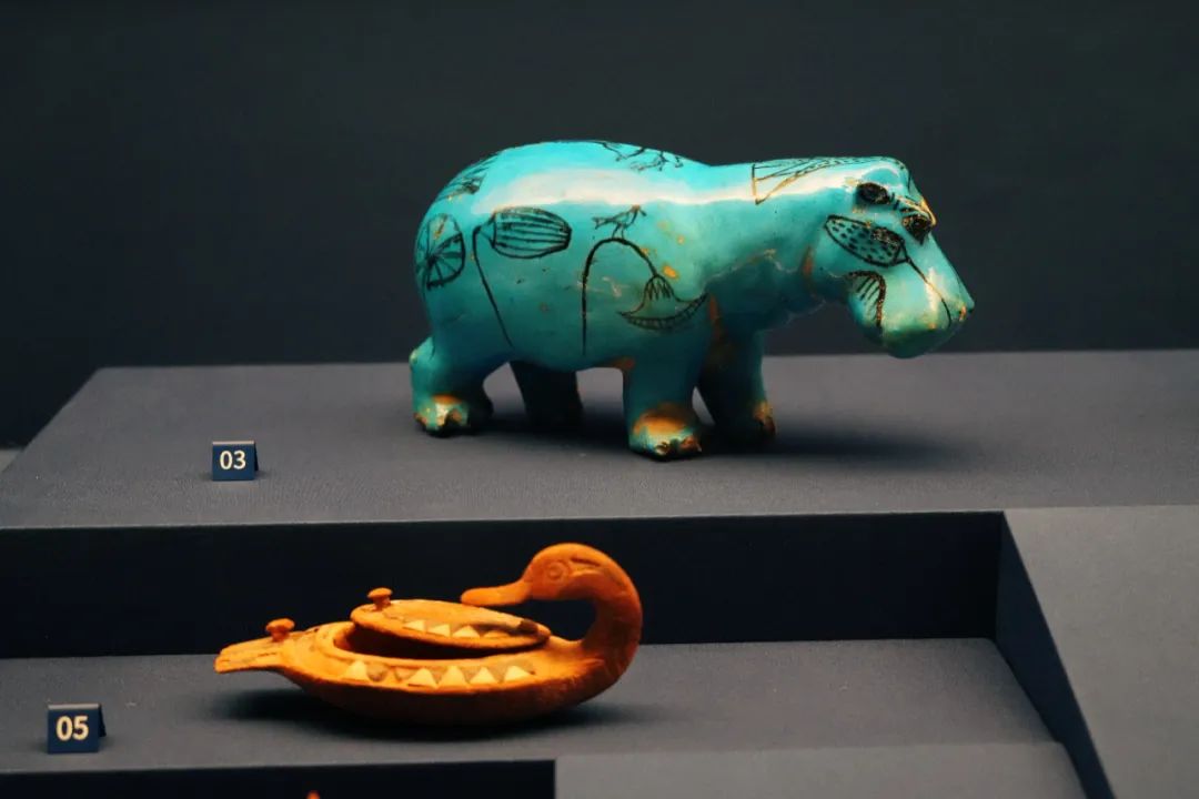古埃及艺术的优雅与写实在动物形象的描绘中达到巅峰——艺术在此处最直接地拥抱着生命。象牙制的马鞭柄呈现出奔跑中的马形;化妆盒仿照野鸭的造型;狮形石质滴水嘴既是装饰,也是建筑的守护神。动物和人物均以最易识别的角度描绘——头部、腿部和脚部为侧面;眼睛和肩膀为正面——创造出一幅理想化且永恒的复合形象。流畅简练的线条构成了这套精致的视觉语言,赋予古埃及艺术一种超越时代、近乎现代的审美感受。