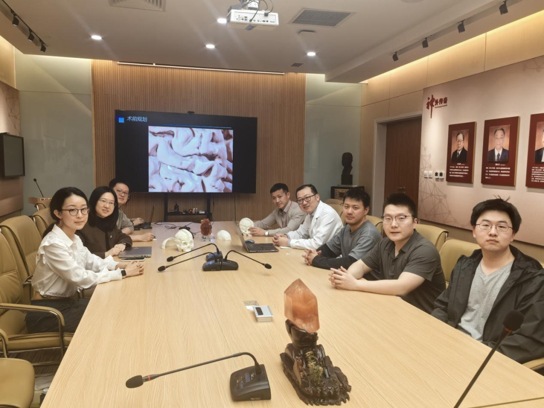 复旦大学附属华山医院路俊锋副教授与阶梯医疗创始人、中国科学院脑智卓越中心研究员赵郑拓博士和李雪博士讨论神经电极在受试者大脑的植入位置