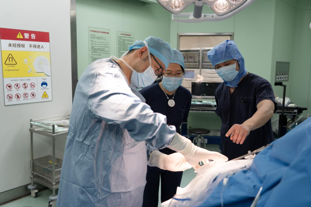 中国首例无线侵入式脑机接口系统前瞻性临床试验手术现场,吴劲松教授、路俊锋副教授和李雪博士做讨论