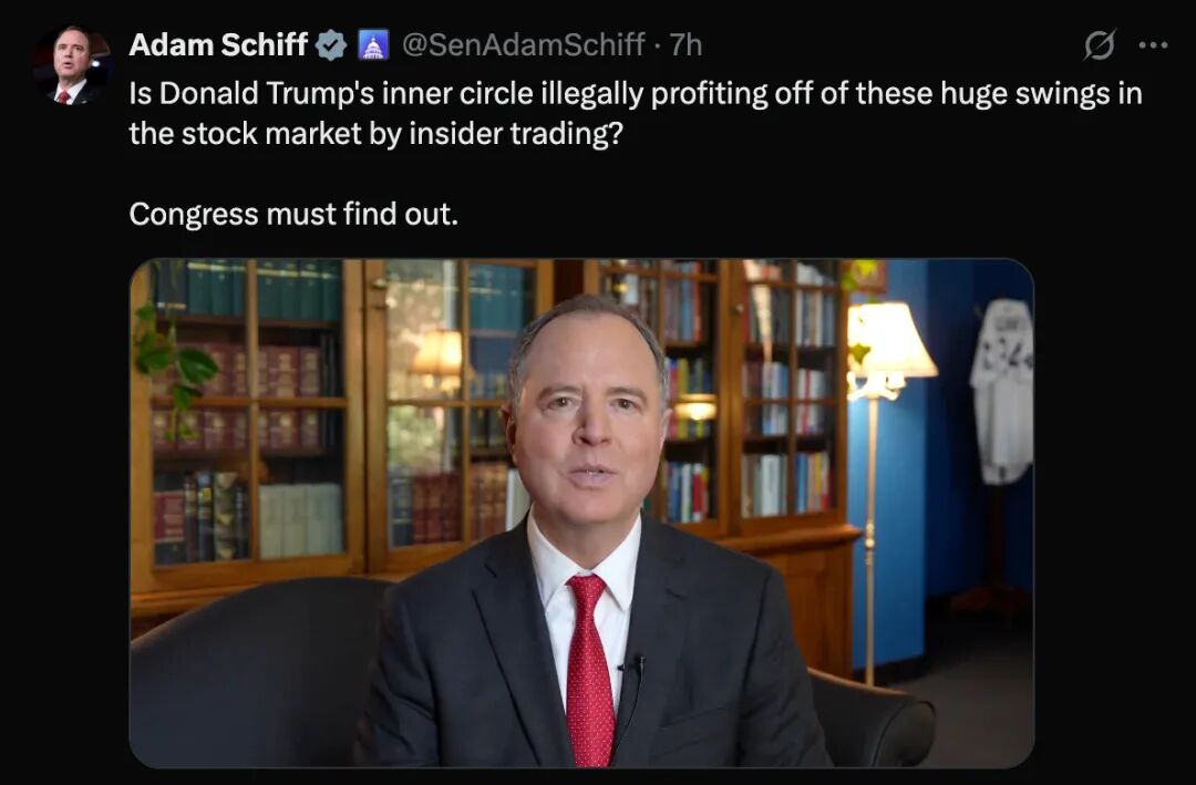 Senator Adam Schiff, a California Democrat, on Wednesday called on Congress to investigate whether President Donald Trump engaged in insider trading or market manipulation when he abruptly paused a sweeping set of tariffs, a move that sent stock prices skyrocketing.