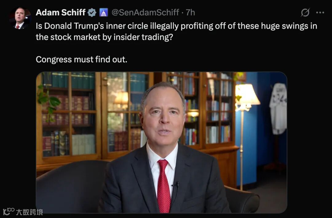 美国加州民主党参议员亚当·希夫(Adam Schiff)周三公开呼吁国会就总统唐纳德·特朗普是否涉嫌内幕交易或市场操纵展开调查。此举源于特朗普突然宣布暂停征收关税后,美股应声飙升,而他本人此前在社交媒体上公开呼吁投资者“抄底”的行为引发轩然大波。