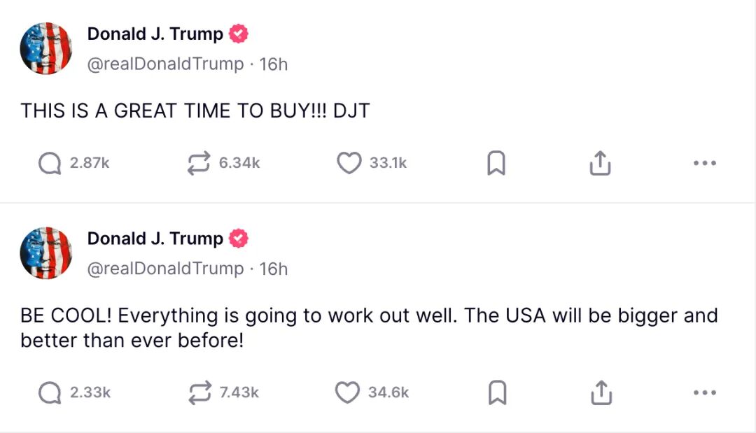 "BE COOL," Trump told his followers on social media after the markets opened. Just a couple of minutes later he wrote, "THIS IS A GREAT TIME TO BUY!!! DJT."