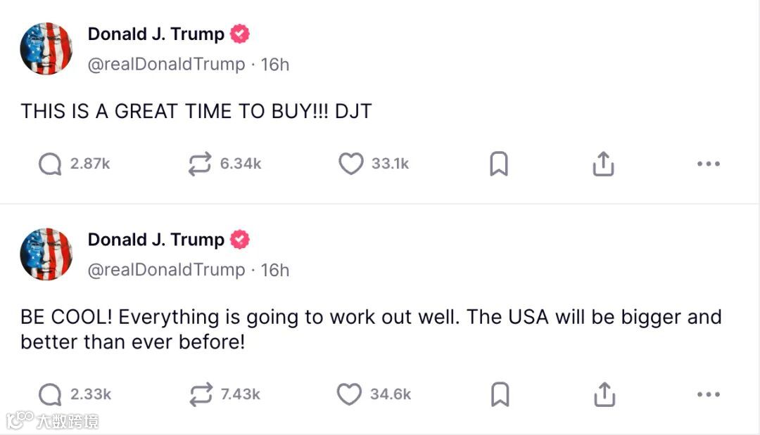 “冷静点!一切都会好起来的。” 美东时间上午,就在美股开盘几分钟后,特朗普在其自创的社媒平台“真实社交”上发帖称。“美国将比以往任何时候都更强大、更强大!”他随后补充道:“现在是买入的好时机!!!DJT。”