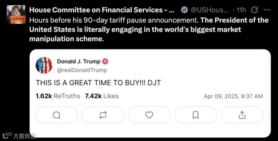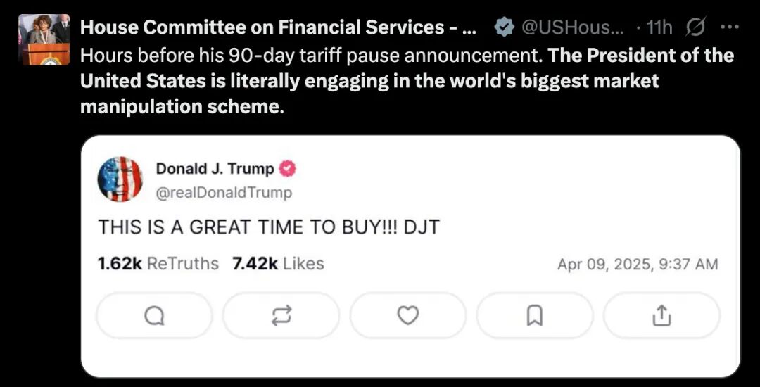 “市场操纵”一词在社交媒体平台X上迅速成为热门话题,相关讨论超3.3万条。众议院金融服务委员会民主党党团官方账号发文抨击:“美国总统实际上参与了世界上最大的市场操纵计划。”