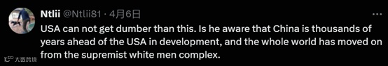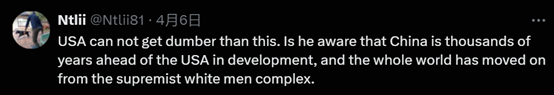 还有网友表示,“美国这番言论简直愚不可及。他不清楚中国在文明发展上领先美国数千年吗?全世界早已摒弃这种白人至上情结了。”