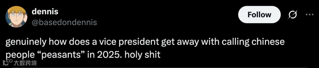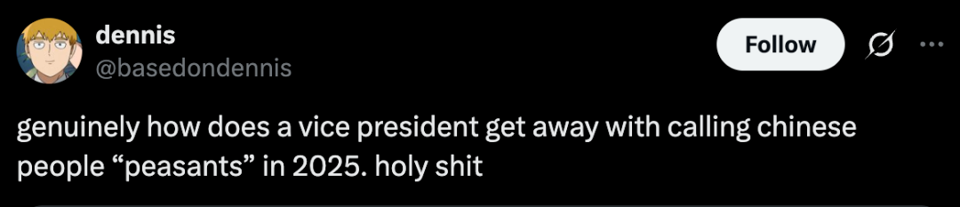 “说真的,2025年了,一个副总统怎么还能称中国人为‘乡巴佬’呢。”