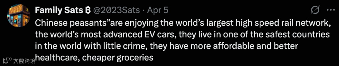 有人讽刺说,他所谓的“‘中国乡巴佬’正享受着世界上最大的高铁网络、世界上最先进的电动汽车,他们生活在世界上最安全的国家之一,犯罪率很低,他们拥有更实惠、更好的医疗保健、更便宜的食品杂货。”