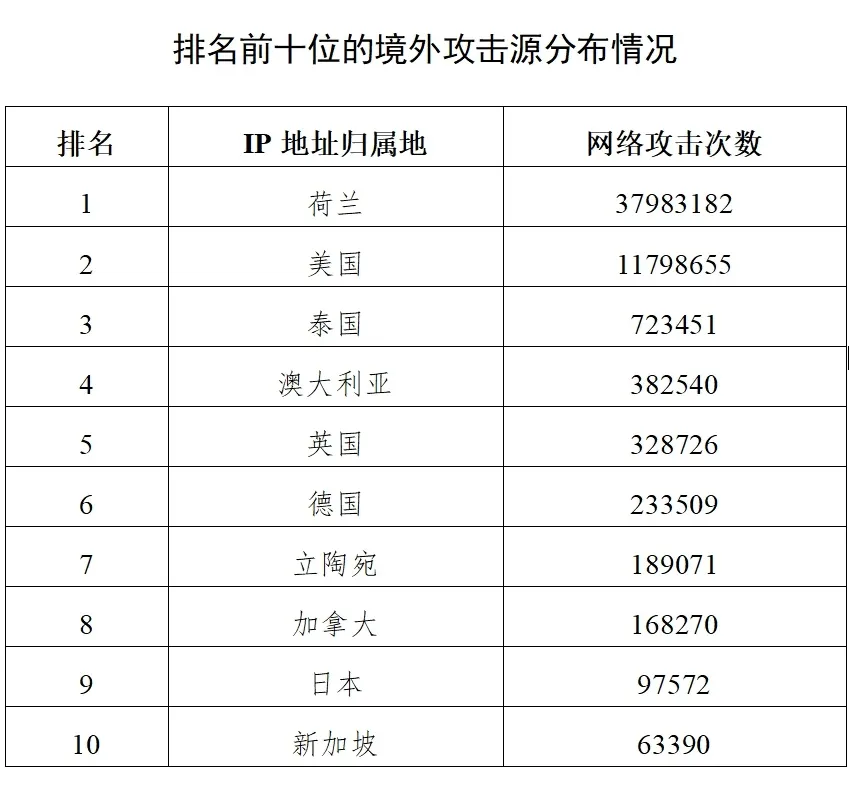 The report also identified cyberattacks targeting key information infrastructure in Heilongjiang province. From Jan 31 to Feb 14, the Netherlands accounted for the largest number of attacks, with 37.98 million, followed by the US with 11.79 million and Thailand with 720,000. Australia, the United Kingdom, Germany, Lithuania, Canada, Japan, and Singapore ranked fourth through tenth.