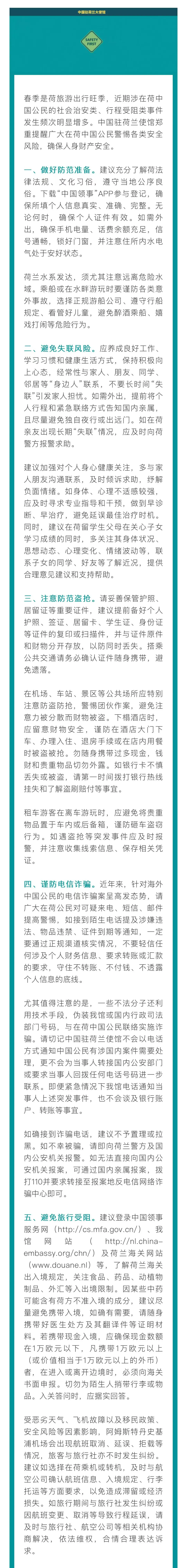 其中提到“避免失联风险”,提醒在荷中国公民要经常性与家人、朋友、同学、邻居等身边人联系,不要长时间“失联”引发家人担忧。如需外出,提前将个人行程和紧急联络方式告知国内亲属,且尽量避免独自夜行或出远门。如在荷亲友出现长期“失联”情况,应及时向荷兰警方报警求助。