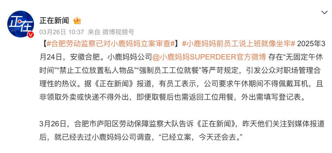 3月26日,合肥市庐阳区劳动保障监察大队告诉媒体,昨天他们关注到媒体报道后,就已经去过小鹿妈妈调查,已经立案。