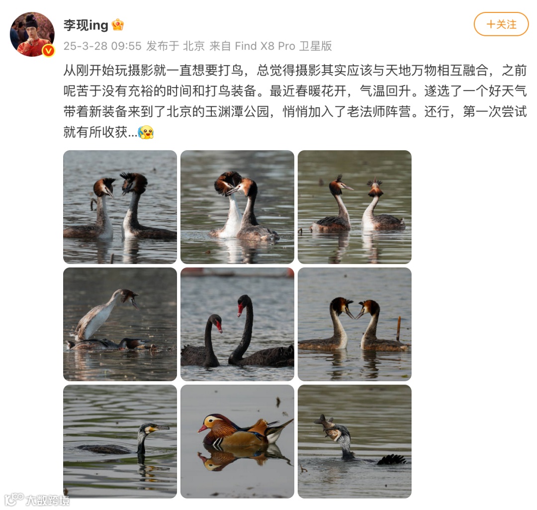 A few days earlier, the actor had already made waves on Sina Weibo, when the topic "Li Xian joins the grandpas' bird photographing club" made to the trending chart on Sina Weibo. The actor himself also posted some photos of birds that he shot at the park.