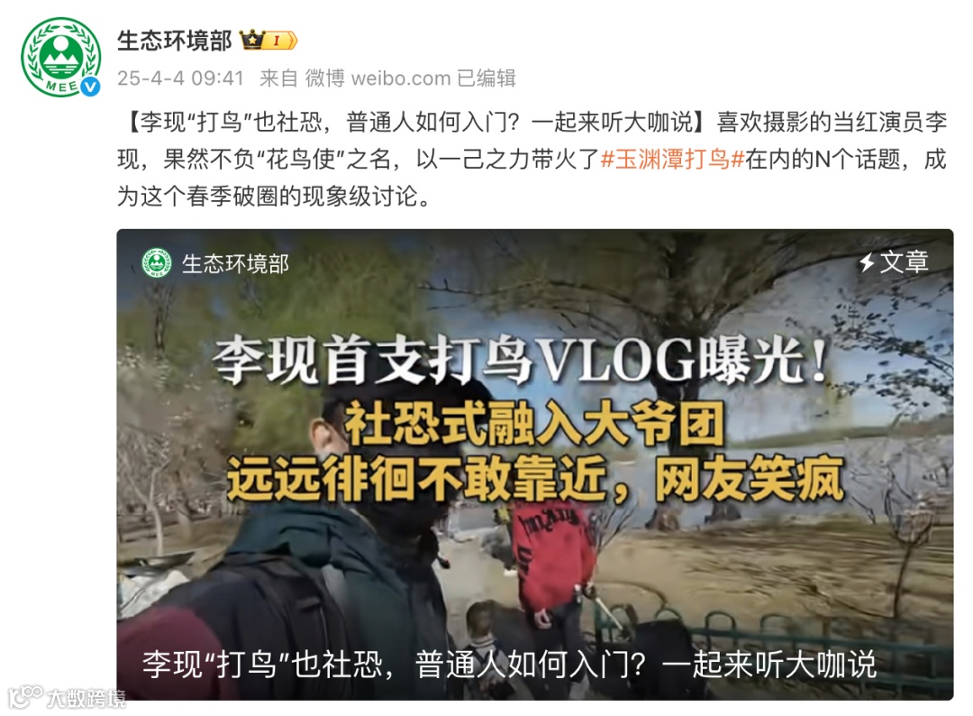 The Ministry of Ecology and Environment posted on Weibo on Friday, stating that the actor Li Xian has single-handedly sparked interest in multiple topics including "birdwatching at Yuyuantan Park" after being spotted in the park birdwatching. Tourism departments across the country are now actively reaching out to Li Xian, inviting him to visit their cities for birdwatching.