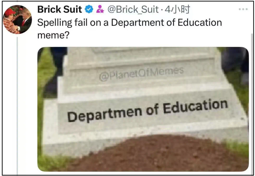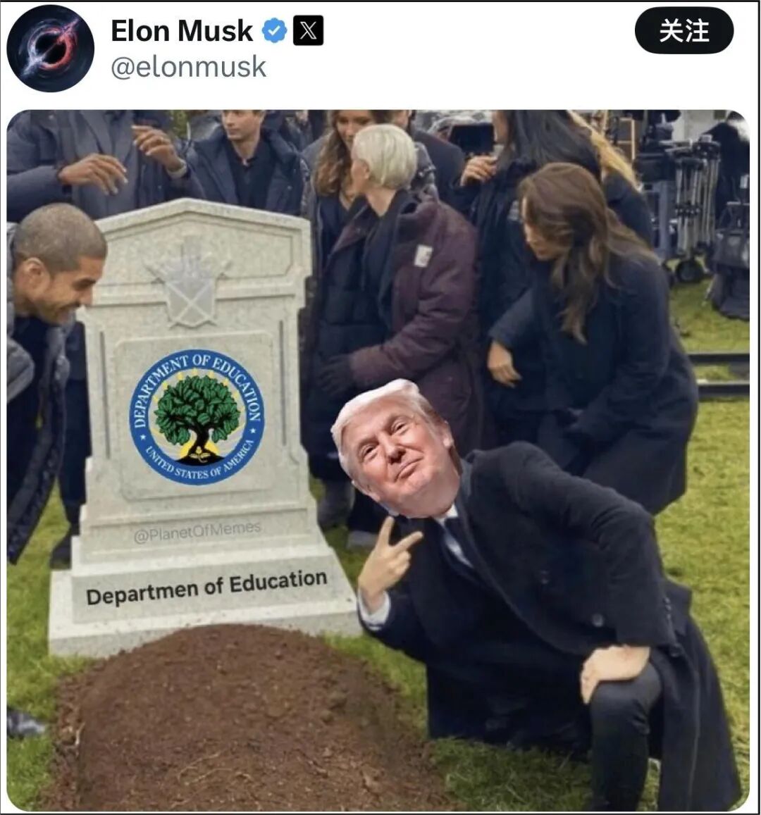 Musk used a well-known meme format depicting a person kneeling before a tombstone. He superimposed Trump's face onto the figure in the image and branded the tombstone with the Department of Education emblem. But beneath the emblem, he mistakenly wrote: "Departmen of Education", omitting the final "T" from "department".