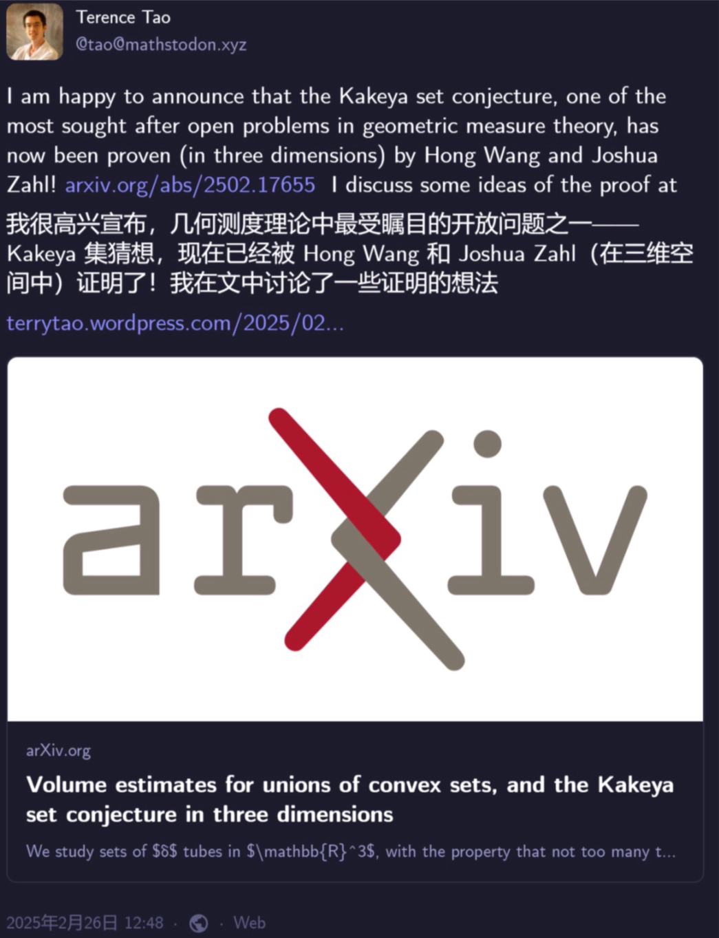 对此,陶哲轩在社交媒体表示对猜想的证明感到很高兴。