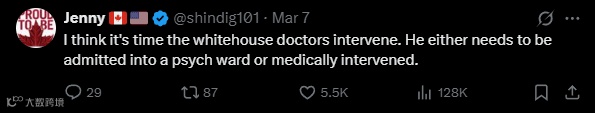 我认为是时候让白宫医生介入了,他要么被送进精神病院,要么接受治疗。
