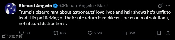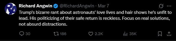 特朗普对宇航员的“爱情生活”和“头发”的怪异言论证明他不适合当领导人。他将宇航员安全返回政治化的行为是极其不负责任的。去关注真正的解决方案,而不是那些荒谬的、不相干的事情。
