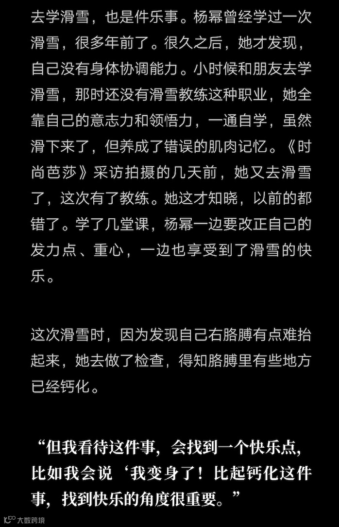 近日,演员杨幂在接受时尚芭莎最新采访时透露。此前滑雪时发现右胳膊难抬起来,去检查发现有些地方已经钙化。她谈对这件事的看法:“会找到一个快乐点,比如我会说‘我变身了!’比起钙化这件事,找到快乐的角度很重要。”