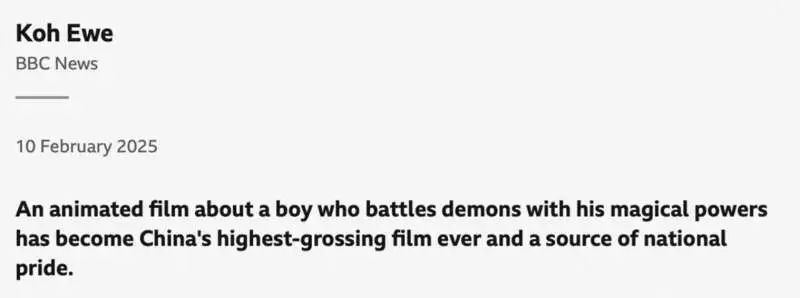 英国广播公司(BBC)在2月10日的报道中称,《哪吒2》已经成为中国有史以来票房最高的电影,也是民族自豪感的源泉。