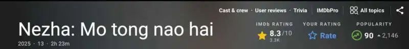 目前,互联网电影资料库(IMDB)网站显示,《哪吒2》评分为8.3分。
