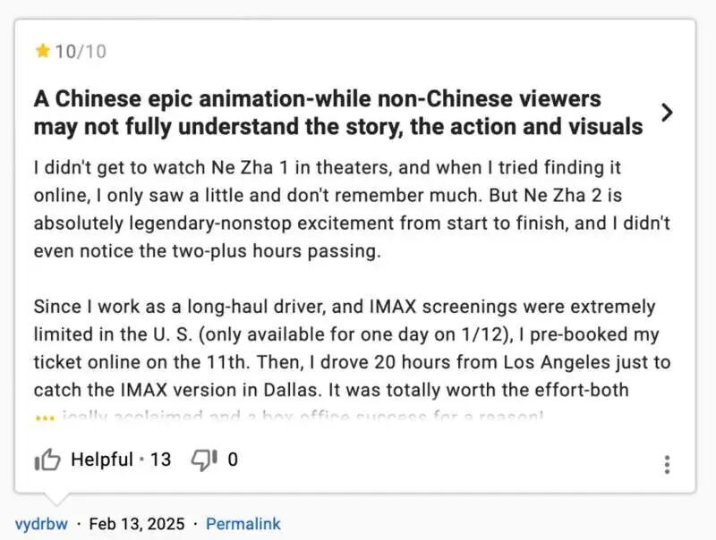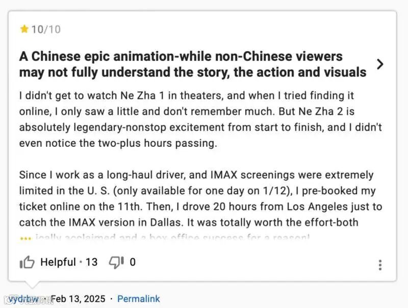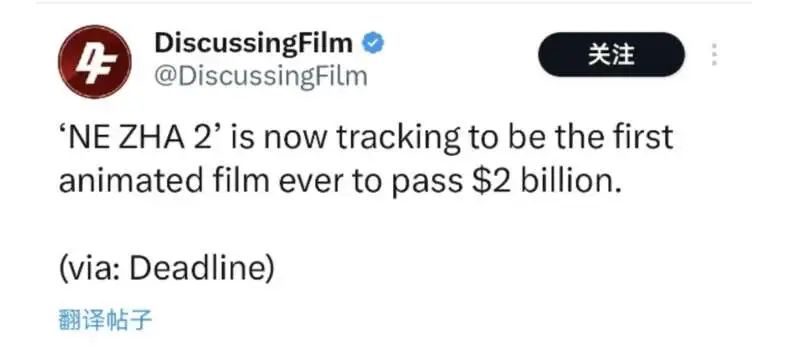 推特电影账号@DiscussingFilm在上映后转引Dealine称,《哪吒2》有望成为有史以来第一部票房超过20亿美元的动画电影。